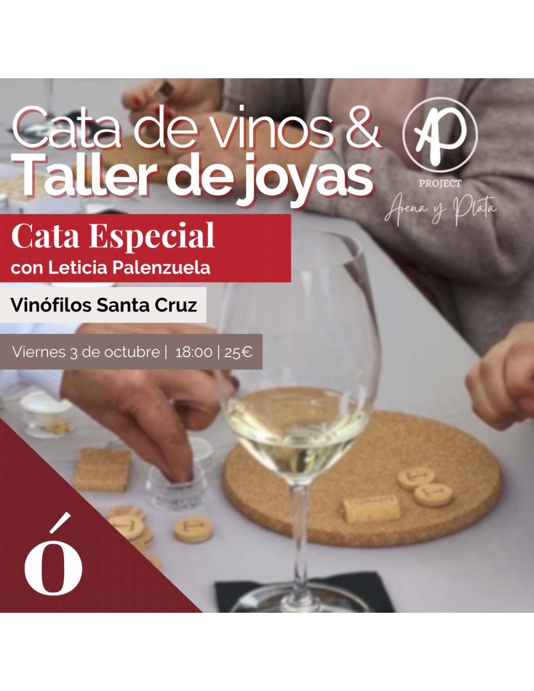Vinos & Taller de Joyas, con Arena&Plata - Elaboración de Joyas con plata y corcho, haciéndole un guiño al vino, acompañado de dos copas de vino.