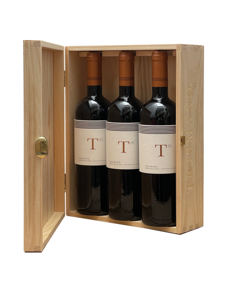 Pack especial de 3 unidades en caja de madera de TM Tr3smano. Alta intensidad y complejidad aromática. Con cuerpo, estructurado, fino, elegante y un largo posgusto. Es un vino hecho para disfrutar y recrearte en cada sorbo y disfrutarlo sin prisas. Además se presenta en una fantástica caja de madera